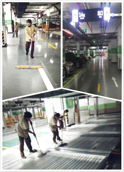 改造施工結(jié)束后,原本地上施工后到處是油漆、灰塵、污漬等。2、3號(hào)樓的保潔們先用鏟子鏟去頑固的附著物,然后用水槍仔細(xì)沖洗,接著用大推布一遍一遍的推擦,眼看著車庫(kù)地面慢慢露出了本來(lái)的顏色,變得越來(lái)越亮,最后再用拖把和抹布把角角落落都擦的干干凈凈。
