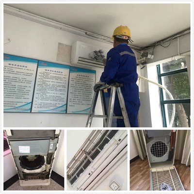 場(chǎng)內(nèi)空調(diào)數(shù)量十分之多,有掛壁式、柜式,還有鑲嵌在天花板上的中央空調(diào),清洗的工程量也很大。項(xiàng)目部安排了一位維保人員、一位保潔員進(jìn)行這項(xiàng)工作,水電工負(fù)責(zé)空調(diào)試用、線路檢查及記錄;一位負(fù)責(zé)拆卸空調(diào)網(wǎng)片;還有一位負(fù)責(zé)清洗網(wǎng)片;兩人相互協(xié)作。掛壁式空調(diào)比較好處理,只需將空調(diào)機(jī)殼打開(kāi),取出內(nèi)置的兩片過(guò)濾網(wǎng),因空調(diào)使用頻繁,網(wǎng)片上沾滿了灰塵,十分臟,負(fù)責(zé)清洗的保潔人員利用刷子把網(wǎng)片在拖把池內(nèi)進(jìn)行清洗沖刷干凈,再由維保人員進(jìn)行安裝上去,然后用抹布將空調(diào)機(jī)殼進(jìn)行擦拭。柜式空調(diào)機(jī)較為難處理,需將柜式空調(diào)機(jī)外殼用十字起拆卸下來(lái),取出濾網(wǎng)進(jìn)行清洗。中央空調(diào)機(jī)則需要登高進(jìn)行拆卸并擦拭。