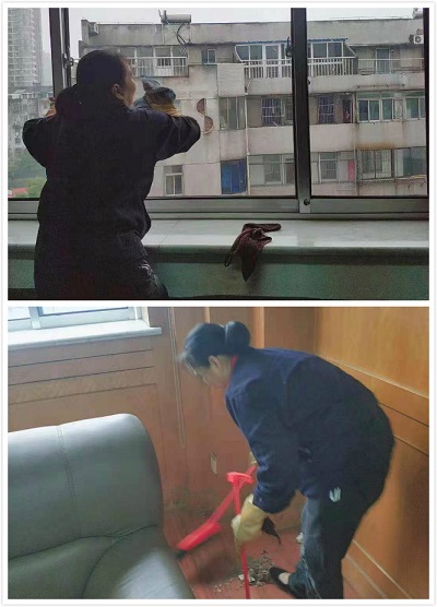 高正集團(tuán)項(xiàng)目部安保人員每天24小時(shí)輪流值守,將每天施工情況匯報(bào)于甲方,日復(fù)一日,堅(jiān)持到現(xiàn)在。如今從十五樓到一樓,開始更換所有辦公室玻璃,從內(nèi)墻到外墻玻璃一層一層的換。更換后辦公室弄特別臟,這無(wú)疑給保潔人員增加了工作量,樓層保潔人員隨時(shí)跟蹤著,更換結(jié)束立即打掃得干干凈凈。煙草大廈共14個(gè)樓層,5個(gè)保潔人員,除了做辦公室和會(huì)議的保潔外,每位保潔人員負(fù)責(zé)四個(gè)樓層,每天除了做好本職工作外,還要打掃裝修后的辦公室衛(wèi)生,工作量加大,但是她們一句抱怨的話都沒(méi)有,總是積極主動(dòng)地干著。