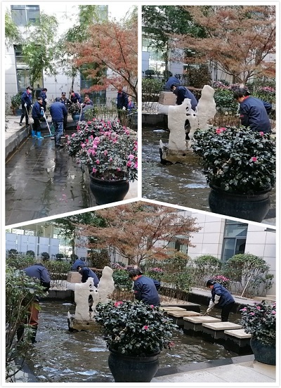 這幾天溫度驟降,盡管穿著雨靴戴著手套,卻也還是抵擋不住河水的冰冷刺骨及迎面而來的寒風。好在大家清理景觀池已是輕車熟路,再加上手腳麻利,很快的景觀池就清理干凈,緊接著放新的水,這項工作圓滿完成。致敬他們不畏嚴寒認真工作的態(tài)度。