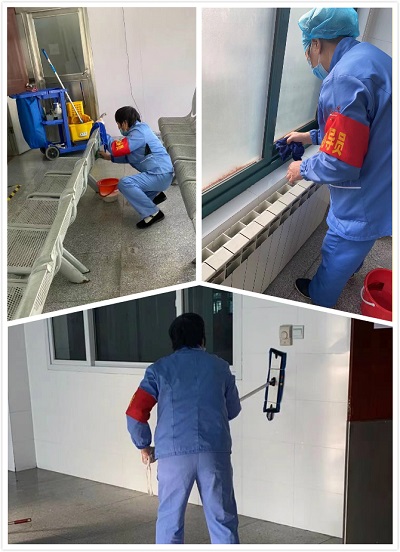 接到通知后,門診主管立刻通知機(jī)動(dòng)人員集合行動(dòng)起來,一個(gè)機(jī)動(dòng)先清掃遺留在地上的裝修垃圾,再用平面拖把墻面擦拭干凈。另一個(gè)機(jī)動(dòng)把玻璃、窗槽等清理干凈。同時(shí)也安排保潔員把地下室拖來的候診椅擦拭干凈,由于放地下室時(shí)間久了,有些污漬需要用百潔片和清潔劑擦拭干凈,再用消毒毛巾擦拭一遍,最后再將所有地面消毒拖洗一遍。