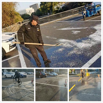經(jīng)過一夜的大雪,30號早晨現(xiàn)場緊急動員起來,管理員、秩序維護員、保潔員全部都投入到化冰化雪的工作中來,首先先環(huán)繞奧體中心全方位做了巡檢,從路面、崗亭到屋檐、樹木都做了詳細的摸排,排除一切安全隱患,對各結(jié)冰區(qū)域鋪撒鹽屑加快融化。崗亭由于大風雨雪天氣也跳電,現(xiàn)場秩序維護員及時報修送電,同時安排好現(xiàn)場車輛繞行。