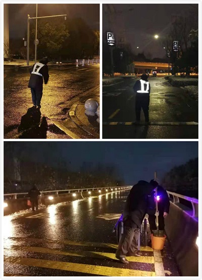 晚上22:00開(kāi)始,在高正集團(tuán)物業(yè)管理員的帶領(lǐng)下,保安隊(duì)員分成三個(gè)小組,一組保持日常秩序管控;二組對(duì)管轄范圍內(nèi)積水進(jìn)行清理以防結(jié)冰;三組對(duì)廣場(chǎng)、停車(chē)場(chǎng)、外圍路段進(jìn)行撒鹽。今年相比較往年撒鹽是比較困難的,沒(méi)有了城管的皮卡車(chē),隊(duì)員用水桶接著工業(yè)鹽各處分撒。氣溫驟降,寒風(fēng)凌冽,物業(yè)人一把一把的將熱情揮灑在了雪地上,讓落雪的美景再一次得到升華...