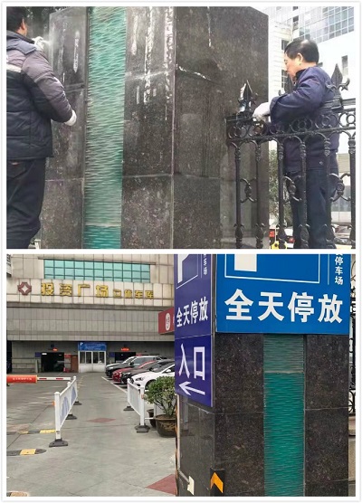 項目部立即安排人員去清理,但在清理的過程中發(fā)現(xiàn),把指示牌拆下以后,外墻上有很多膠水,很難清除。這一幕正好被在廣場上的戴師傅看到了,戴師傅看了一下說:“你們先別弄,我去拿除膠劑!辈灰粫䞍海鲙煾稻湍脕砹顺z劑,戴師傅先把外墻表面處理干凈,涂抹適量的除膠劑于外墻上的膠水,需要完全覆蓋,待其軟化后,再用工具刮除即可。