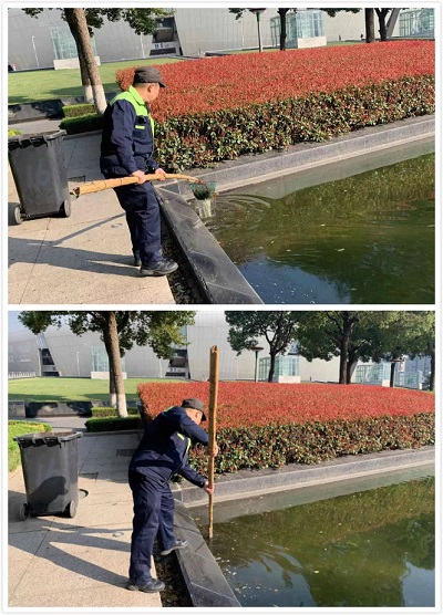 古有黛玉葬花,今有保潔撈葉。為了給常州廣大市民營造一個美麗舒適的運動環(huán)境,積極響應政府“全民運動”的號召,高正集團奧體中心物業(yè)部保潔主管郁志賢帶領(lǐng)其組員一起打撈奧體周邊景觀河里面的落葉,保持水質(zhì)清澈,水源充足,并且每天巡查花壇周邊的警示牌,保障完好無缺。