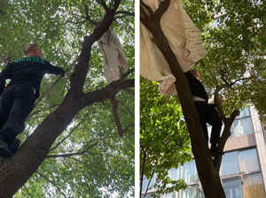 我們在接到業(yè)主求助后,總能在力所能及的范圍內第一時間進行處理,急業(yè)主所急。在五一小長假內,1幢業(yè)主晾曬在戶外的床單被風吹掛在樹上,徐師傅接到業(yè)主求助后,第一時間就拿起梯子前往現(xiàn)場。他不顧自身安危,攀爬上樹幫業(yè)主取下床單,及時解決了業(yè)主的困擾。