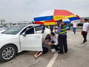 2021年5月25日的東臺(tái)服務(wù)區(qū)廣場(chǎng)川流不息,大家都在井然有序的工作中.我公司保安周禮峰于11:37分在西區(qū)保安崗?fù)で皬V場(chǎng)執(zhí)勤時(shí),發(fā)現(xiàn)一位旅客突然倒在車位上,面色難看。立即跑步前去詢問(wèn)。倒地顧客還沒(méi)有昏迷,保安見(jiàn)狀即刻打電話匯報(bào),服務(wù)區(qū)管理人員知曉后第一時(shí)間趕到事發(fā)現(xiàn)場(chǎng),立即啟動(dòng)應(yīng)急預(yù)案,用對(duì)講機(jī)召集其他保安前來(lái)幫忙,管理人員邊安排保安拿來(lái)遮陽(yáng)傘,邊匯報(bào)給甲方值班人員。