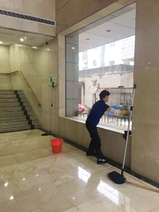 然后提來水,先把抹布蘸濕一下,把整個大門擦一遍,然后再重新?lián)Q上一桶調(diào)擦拭玻璃專用的水,再擦拭一遍,接下來就開始用上她的“武器”。一個普通的玻璃桿,在她手里靈動的揮舞著,擦完里面,又擦外面,很快就讓整個大門玻璃潔凈照人。此時,張建梅的工作服已被汗水浸濕了一片,可她并未理會,看著干凈的玻璃終于滿意的笑了。