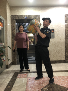近日,和往常一樣,投資廣場(chǎng)項(xiàng)目部保安曹津巡完樓以后,正準(zhǔn)備回到南門(mén)休息室去,他看到一名女士站在快遞柜前,站了很久,像是遇到了什么困難,曹津看到后,立即上前詢問(wèn)這名女士:“有什么可以幫助您的?”這名女士說(shuō):“我的快遞在最上面這個(gè)快遞柜里,拿不出來(lái)了,卡在里面了!辈芙蚩戳艘谎劭爝f柜,堅(jiān)定地對(duì)這名女士說(shuō):“沒(méi)事,小問(wèn)題,我來(lái)幫您拿!辈芙蚩戳艘谎畚恢,想了一下:因?yàn)槿苏驹诘紫,快遞卡在快遞柜門(mén)口,加之快遞又重,不太好拿出來(lái),所以他決定去休息室拿把椅子出來(lái),人站在椅子上,先將快遞往快遞柜格子里推一下,將快遞擺正好位置,再將其拿出,又考慮到這名女士穿著高跟鞋,快遞又重,曹津熱心的說(shuō):“我?guī)湍玫睫k公室去吧!敝灰(jiàn)曹津?qū)⒖爝f扛在肩上,走向電梯。