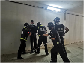 此次模擬演練以服務區(qū)保安發(fā)現(xiàn)一名男子要求從邊門進入服務區(qū)搭車。遭拒絕后從偏僻處翻越圍墻進入服務區(qū)(隨即在廣場等候?qū)ふ臆囕v搭乘)。被巡查保安員發(fā)現(xiàn)并要求其離開,交涉過程中突然男子情緒激動。從包里掏出攜帶的利器刺向保安,所幸保安反應快,避開兇器逃離(利用規(guī)勸、警告等方式誘導男子離開人群密集處朝員工通道跑去)。并利用隨身對講機呼救,其他保安員立即展開行動,分別持防暴恐工具進行圍堵攔截。最后制服并交由公安帶走處理。