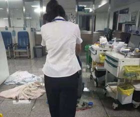 門診處項目主管和內(nèi)科樓項目主管接到甲方電話后,第一時間去現(xiàn)場查看,了解情況后,兩位主管決定和夜班的值班工友們一起處理。他們推來磨地機器和吸水機器,先把主要過道進(jìn)行吸水處理,在整個過程中大家都很有耐心的在干活,沒有一點抱怨。