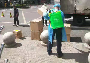 對于醫(yī)院里來的物料物資也一樣把控嚴(yán)格。每當(dāng)來了物料,甲方會先通知我們物業(yè)的機(jī)動人員對物資進(jìn)行全面消毒。駕駛員先把貨卸下來放在空地上,王師傅接到通知后先去把泡騰片調(diào)和到500mg/l濃度后倒入噴霧器,再穿上準(zhǔn)備好的隔離衣,戴上帽子開始消毒。