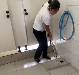 下午12點(diǎn)30分左右,保潔阿姨們已提前準(zhǔn)備好工具,如潔廁劑,洗衣粉,馬桶刷,地推刷,消毒水等等。物業(yè)項(xiàng)目負(fù)責(zé)人和保潔阿姨們,帶著工具來到保安門崗進(jìn)行全面的清洗以及消毒工作。項(xiàng)目負(fù)責(zé)人給每個人都進(jìn)行了明確的工作分工,保安先拿水管把門崗里外都沖洗一遍,沖洗完了墻面地面以及門窗,再用洗衣粉全部涮一遍再進(jìn)行沖洗,反反復(fù)復(fù)前后沖洗了三遍,不留任何死角,最后再全面里外消殺一遍。整個過程我們只用了35分鐘,保安門崗和衛(wèi)生間也煥然一新,大家都露出了開心的笑容。