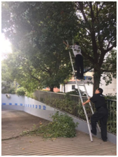 9月17日下午,保安隊長王宏臣對項目進行逐個排查,當(dāng)檢查到地下車庫時,發(fā)現(xiàn)地下車庫口的樹枝太長,影響視線。他二話沒說就拿起梯子和鋸齒,開始對樹木進行修剪,這雖然不屬于我們物業(yè)的本職工作,但為了規(guī)避風(fēng)險,也確保甲方工作人員能安全停車。項目組的安保人員,主動將臨近電線的枝干進行修剪,并且對坡道綠化棄料進行了清理。