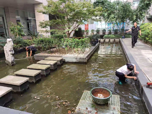 為了改善低溫中心的環(huán)境,也為了還客戶一道美麗的景觀池風景線,項目組主管決定對小區(qū)景觀水池進行大清洗。一大早物業(yè)主管就開始給大家布置工作任務,大家收到任務后,拿起鐵鍬、掃帚、鏟子、刷子、高壓水槍等工具,進入水池忙碌起來。
