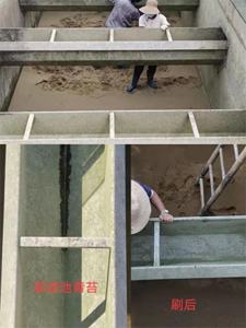 近3個月的高溫天氣,濾池內(nèi)長期處于潮濕環(huán)境,非常容易滋生藻類,池壁上經(jīng)過長時間的沉淀,附著了很多泥垢,粘粘在池壁上很難清洗,而日常的濾池反沖洗根本無法將其徹底沖刷干凈。為保障優(yōu)質(zhì)供水,自來水廠管理部組織項目員工對濾池進行徹底的大清洗工作。