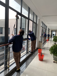 為了使整個(gè)院區(qū)的環(huán)境看起來更加干凈整潔,下午保潔班長安排全體保潔進(jìn)行清擦玻璃的工作。班長首先對(duì)大家進(jìn)行了分工和清掃區(qū)域的劃分,由兩人合作,各自領(lǐng)好清擦工具后,大家就熱火朝天的投入到工作中去了。大家認(rèn)真負(fù)責(zé)的把玻璃和門框上的灰塵全部擦洗干凈,連窗縫里的灰塵都沒有放過。外圍的窗戶有夠不到的地方,大家也想盡辦法進(jìn)行擦拭。大家齊心協(xié)力,經(jīng)過一個(gè)下午的勞作,整個(gè)大樓都煥然一新,看著窗明幾凈的玻璃,大家都露出了笑容。