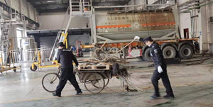 B車(chē)間因?yàn)槭┕じ脑,打掃起?lái)比較困難,保安師傅先拿三輪車(chē)把垃圾一車(chē)車(chē)清運(yùn)出去,保潔再分工把片區(qū)垃圾和灰塵全部清掃干凈,然后再進(jìn)行地面的沖刷打掃,直至干凈整潔。