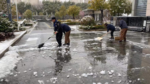 此次降雪,雪量大、持續(xù)時(shí)間長(zhǎng)、降溫明顯,為物業(yè)人的工作開(kāi)展帶來(lái)了不少難題。雪情就是命令,盡管開(kāi)工第一天,進(jìn)院辦公人員較少,但為了更好的確保院內(nèi)各通道通暢,項(xiàng)目部組織了全體當(dāng)班物業(yè)員工進(jìn)行掃雪除冰工作,為甲方人員的安全出行保駕護(hù)航。