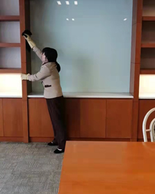 21樓是水務(wù)大廈空置率最高的一個(gè)樓層,甲方要求我們把21樓朝南的房間全部清理出來。說干就干,21樓總共八個(gè)房間,房間的地毯,窗簾,所有的柜子,門窗統(tǒng)統(tǒng)都要清理,由于房間一直空著,自然沒有人前去管理,污垢、灰塵、蜘蛛網(wǎng)到處都是,阿姨們打水一遍一遍的擦拭著柜子,門窗。磨地工用洗地機(jī)先把地毯用藥水清洗一遍,再用吸水機(jī)把水吸干凈,這樣地毯才會干的快一點(diǎn),維修師傅又把所有地面插座和開關(guān)以及照明燈具檢查并修理一遍。