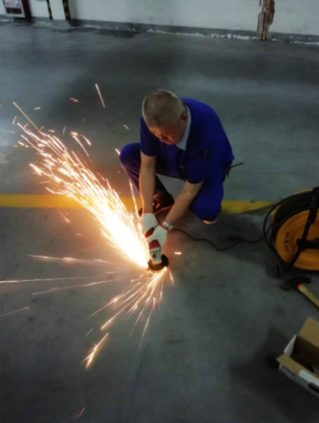 2019年6月5日這天最高氣溫35度,地表溫度達(dá)到了42度。本項(xiàng)目工程人員賀俊,在日常巡檢中,發(fā)現(xiàn)進(jìn)入地下車庫(kù)的入口減速帶損壞,遺留下的釘子很鋒利,極有可能對(duì)進(jìn)入車庫(kù)的車輛輪胎造成嚴(yán)重破壞,車輛輪胎一旦發(fā)生損壞后果不堪設(shè)想,賀俊第一時(shí)間攜帶工具,設(shè)立施工提示牌,展開了有效的切除。