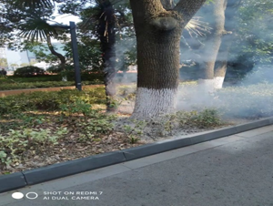 2022年3月7日,袁主管正在中天鋼鐵體育館場外的環(huán)形路上進行日常的巡查工作,當他巡查到垃圾房時,發(fā)現(xiàn)綠化帶上有一處起火點,火勢已蔓延至周圍的綠植,且現(xiàn)場濃煙滾滾,來往的路人均掩住口鼻,連連咳嗽;饎蓦m不大,但已嚴重影響到現(xiàn)場的空氣環(huán)境。
