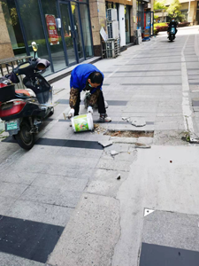 為了確保業(yè)主們能順暢安全的出行,張師傅立即找來(lái)工具,把地板磚撬起來(lái),在地板磚缺失處用水泥澆灌鋪平,并用樁頭安放在一旁,他一人反復(fù)澆灌調(diào)試多次,終于在經(jīng)過(guò)一個(gè)小時(shí)的“奮戰(zhàn)”后,將破損的路面及時(shí)修復(fù)完成,杜絕了安全隱患。