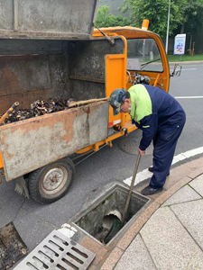 樹(shù)葉太多郁主管也熱火朝天的和保潔員們一起干起來(lái),在每掏一段陰溝之前,大家都會(huì)在地面放錐形筒,以做到提示鍛煉的市民暫不要走此段路程。奧體面積大,陰井溝比較多,大家一起一直忙了一下午才把所有的樹(shù)葉垃圾清理干凈。馬上夏天到了,雨水更多,如果不打掃下水道很容易會(huì)發(fā)生堵塞,雨水排不掉,將會(huì)存在一定的安全隱患。