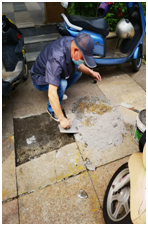 為了確保業(yè)主的出行安全,徐師傅當(dāng)即決定修繕此處破損路面。他首先找來(lái)工具把地板磚撬起來(lái),再用水泥澆灌鋪平。天氣炎熱,徐師傅一人承擔(dān)了所有的修繕工作,短短一小時(shí),他就熱得汗流浹背,但他沒(méi)有絲毫抱怨,直到將所有工作完成,他才放下手中工具。隨后他又用腳踢了踢,確保無(wú)任何問(wèn)題后,他才拿著他的工具箱趕赴下一個(gè)工作點(diǎn)。