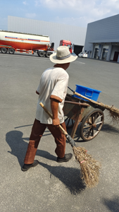 夏天的太陽像個(gè)大火爐,把大地烤的發(fā)燙,空氣也是熱烘烘的,稍微一動(dòng)就渾身是汗。清晨六點(diǎn)鐘,低溫中心外圍保潔師傅已經(jīng)到崗展開一天的工作,他推上小推車以及所需的保潔用具,先對(duì)院里停車位以及外圍路面開展清掃,樹葉零零灑灑的鋪滿了院區(qū)路面,經(jīng)過他勤勞的清掃,整潔干凈的環(huán)境呈現(xiàn)在眼前;覊m點(diǎn)點(diǎn)的院區(qū)垃圾桶,經(jīng)過他擦拭,瞬時(shí)變得整潔明亮,陽光下閃閃發(fā)光。只要有污垢,就有他的身影,只要有落葉,就有他嘩嘩的掃把聲。
