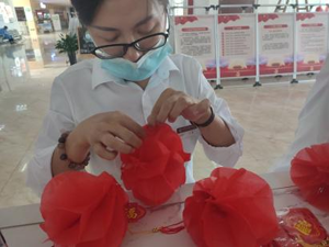 走進(jìn)服務(wù)區(qū),迎面而來(lái)的是一面面鮮艷的五星紅旗和帶有濃厚氛圍的小紅燈籠。看,在服務(wù)臺(tái)前,工作人員正在制作一個(gè)個(gè)充滿節(jié)日氛圍的紅燈籠。抬頭一看,原來(lái)是工程師傅在天花板上懸掛國(guó)旗。