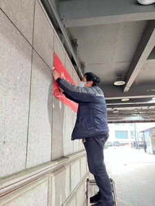 近日,工程師傅在一次例行檢查中發(fā)現(xiàn)掛在立體車庫墻上的一條宣傳橫幅被大風(fēng)吹落,由于橫幅比較高,戴師傅只能拿上梯子,用透明膠帶一點(diǎn)一點(diǎn)地把橫幅粘上,時(shí)不時(shí)的還要看看粘的位置正不正,不一會(huì)兒,就聽見戴師傅說:“可以了”。他隨即又從梯子上下來看了看橫幅,又聽見他說:“位置已經(jīng)擺正了,可以了。”
