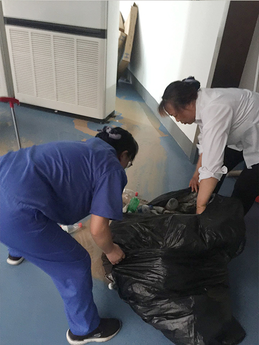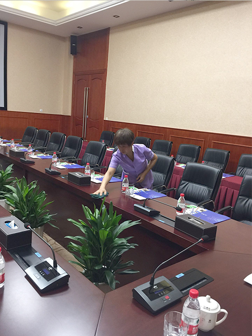 23日展廳現(xiàn)場(chǎng)人員比較多:有安裝空調(diào)施工人員、有科技園工作人員、安檢設(shè)備安裝調(diào)試人員、現(xiàn)場(chǎng)接待講解人員、北京增援人員......保潔工作要做好,必須安排好工作細(xì)節(jié):一人專擦地面擦痕,一人專職拖運(yùn)水并負(fù)責(zé)傾倒3臺(tái)空調(diào)積水,兩人負(fù)責(zé)來(lái)回不間斷的拖洗地面,一人負(fù)責(zé)清運(yùn)垃圾,確保現(xiàn)場(chǎng)地面整潔干凈。細(xì)致的分工圓滿完成了23日的保潔工作。24日25日晚上項(xiàng)目經(jīng)理帶領(lǐng)展廳人員加班,確保展廳和快檢場(chǎng)地的環(huán)境衛(wèi)生。會(huì)議結(jié)束后立刻打掃會(huì)議室為下場(chǎng)的會(huì)議做好準(zhǔn)備工作。