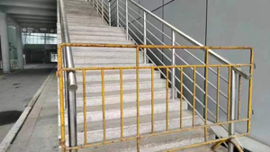 我公司安保人員在巡查中發(fā)現(xiàn),由外面行車道通往會展館2樓的一個備用樓梯口副通道口,用以臨時關閉通道而設置的鐵馬出現(xiàn)了固定點脫落,鐵馬傾斜的情況。發(fā)現(xiàn)狀況后,保安人員立即找來鉗子和鐵絲等工具,將原來斷裂脫落的鐵絲清理干凈,再將鐵馬上端兩側均用鐵絲牢固地捆綁在了金屬護手上,下端站立在臺階最下面一級的地面上,再用捆扎帶將鐵馬的腳與護欄支撐桿捆扎在一起。經(jīng)過維護后的鐵馬和護欄整潔牢固的固定在一起,宛如一體。