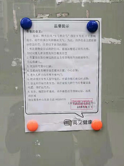 8月份的溫度還是居高不下,據(jù)氣象臺發(fā)布的消息,特大臺風9號利奇馬預(yù)計9號到11號影響我市,將伴有強臺風和暴雨天氣。我們太湖明珠苑物業(yè)積極響應(yīng)相關(guān)部門的要求,開始啟動防洪應(yīng)急預(yù)案,為了避免小區(qū)可能發(fā)生的安全隱患。
