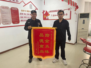 近日,乾盛蘭庭項(xiàng)目部收到3甲-2503業(yè)主專程送予保安師傅肖玉兵印有“拾金不昧、品德高尚”金色大字的一面錦旗,他激動(dòng)得握著肖玉兵的雙手對他表示謝意“太感謝肖師傅您了,真沒想到我的手機(jī)還能失而復(fù)得,手機(jī)里的文件信息和工作數(shù)據(jù)對我太重要了。”而我們的保安肖師傅卻只是淡淡地說了句“不客氣,這是我應(yīng)該做的!