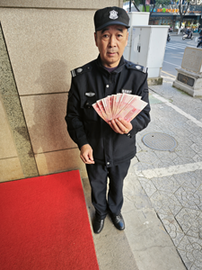 近日,常州移動晉陵樓北門值崗保安王雙全,在崗期間發(fā)現(xiàn)一外賣小哥騎電動車經(jīng)過時,兜里的錢不慎掉落,大量現(xiàn)金洋洋灑灑一路飄在地上。王雙全看見此情況,立馬大聲呼喊外賣小哥,但外賣小哥騎車速度較快,沒有聽見。