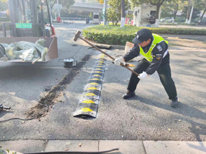 由于停車場是高鐵場站的重要組成部分,車輛在進出停車場時需要經過減速帶,而維護不善的減速帶存在著嚴重的安全隱患。為了解決停車場減速帶老化和維護不善的問題,對高鐵場站停車場的減速帶進行定期檢查和維護是至關重要的。近日,地面停車場秩序維護員在區(qū)域巡邏時發(fā)現有一處減速帶嚴重損壞,中間露出兩排鋼釘,不僅失去了減速的作用,還容易將過往車輛的車胎扎破。他立即將這一問題上報領導,項目經理劉源迅速對現場情況進行查看,并與相關部門對接聯系,隨后秩序維護員劉本良協助維修班工作員對地面停車場靠4號崗亭交叉路口的破損減速帶進行了更換,給過往的車輛和行人提供了便利,確保通行安全。