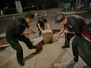 于是,曹后生果斷采取行動(dòng),他立即將此情況上報(bào)給當(dāng)班值班長(zhǎng)。值班長(zhǎng)接到報(bào)告后,迅速趕到現(xiàn)場(chǎng),并緊急調(diào)集其他保安人員。他們圍繞如何安全、高效地處理這一問(wèn)題展開(kāi)了簡(jiǎn)短的討論,并很快達(dá)成一致意見(jiàn)——大家合力將石墩搬回原位。經(jīng)過(guò)一番精心的安排和協(xié)作,兩名保安人員用水帶環(huán)住石墩,用力往上拉,而另一名保安則負(fù)責(zé)在石墩下方進(jìn)行推動(dòng)。在他們的共同努力下,石墩終于被穩(wěn)穩(wěn)當(dāng)當(dāng)?shù)胤呕亓嗽,道路也恢?fù)了暢通。