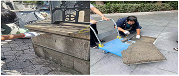 近日,投資廣場項目部在巡邏時發(fā)現(xiàn)圍墻外圍一塊墻體磚脫落,廣場上的地磚由于車輛的碾壓翹起,這樣既有礙美觀又存在安全隱患。為了確保業(yè)主能順暢安全出行,工程部師傅帶著鐵鍬和榔頭,等車流高峰期過后才開始維修,戴師傅從倉庫拿來之前裝修剩下的水泥材料,擼起袖子就開始修補和平整工作。他先撿起掉落的磚塊放回原位找平,再用水泥澆灌鋪平,在戴師傅精湛的手藝下,墻體被恢復(fù)如初。戴師傅說這是項長期工作,以后的每個夏天都需要每天撒一次水,要不然容易開裂。