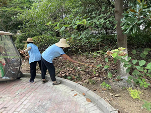 上午9點開始,南北區(qū)域的保潔在保潔主管的帶領(lǐng)下正式開展清掃工作。因小區(qū)綠化面積較大,保潔主管安排就近兩區(qū)域的保潔兩兩一組組隊開展工作。先是保潔拿著耙子把圍在灌木叢中的落葉扒出來,再用掃把把落葉都掃成一堆一堆的,最后拿大袋子把落葉裝起來由保潔班長清運到垃圾堆放點內(nèi)。從上午9點到下午4點,保潔們一直重復(fù)著耙落葉、掃落葉、裝落葉和運落葉的動作,每個人都干得汗流浹背,最終在保潔班長清運到15車時,清掃行動圓滿結(jié)束?粗兊谜麧嵡逅木G化帶,大家瞬間覺得付出的汗水都值得了。