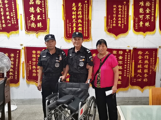 9月4日中午12:00,項目經(jīng)理梁燕接到了住院部13樓康復理療科的護士長電話,說有病人在做康復理療時丟失一臺價值一千多元的輪椅,要求查看監(jiān)控,詢問如何辦理手續(xù)。項目經(jīng)理要求樓層保安進行巡邏,查看是否有可疑人員,此時距離輪椅丟失已經(jīng)過了一個多小時。而上午,我們保安在醫(yī)技樓發(fā)現(xiàn)一部新輪椅,無人問津。滾動班的保安及時向班長葉木橋匯報了這一情況,葉班長意識到可能是病人丟失的,先收起來送到物業(yè)辦公室,并及時向項目經(jīng)理梁燕匯報了此事。梁經(jīng)理及時和康復科護士長反饋了這一情況。原來是護工在推病人做理療時,將輪椅遺忘在走道上,被其他做理療的病人推走,還好高正的保安及時發(fā)現(xiàn)并保管了這部新輪椅,護工阿姨為了表示感謝,特地做了一面錦旗,送到了物業(yè)辦公室。