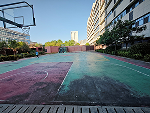今日下午,院方臨時(shí)通知即將舉行一場(chǎng)趣味運(yùn)動(dòng)會(huì)。接到通知后,項(xiàng)目部迅速展開(kāi)行動(dòng),對(duì)籃球場(chǎng)進(jìn)行了一次突擊清理。由于籃球場(chǎng)施工工藝原因,地面出現(xiàn)起皮脫落現(xiàn)象,加之日常使用頻繁,污漬緊緊嵌入在裂縫中,使得整個(gè)籃球場(chǎng)顯得非常臟亂。