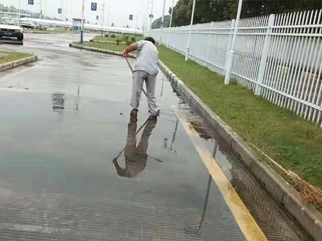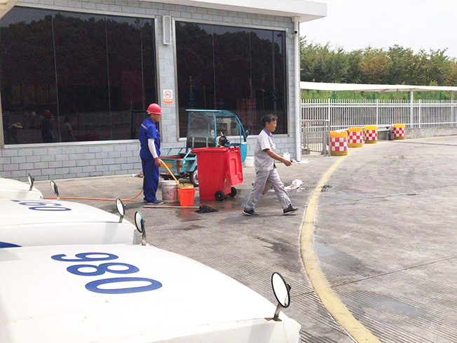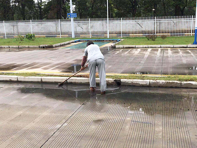 我們利用不考試不訓(xùn)練的時(shí)間空檔,對(duì)場(chǎng)地及地標(biāo)進(jìn)行了一個(gè)清理工作。因工具有限,我們保潔人員只能一桶一桶的把水拎到所要清洗的地方,一個(gè)維保人員進(jìn)行放水、裝水工作,這給我們的清洗工作延長(zhǎng)了不少的時(shí)間,也降低了保潔人員清刷的速度。保潔員把水拎到所要清洗的地標(biāo)線,先用少量的水將臟地浸泡,再用硬毛地刷進(jìn)行初步的清刷工作,再利用拖把進(jìn)行一個(gè)拖擦,最后再用清水進(jìn)行一個(gè)沖洗的收尾工作。為確保地標(biāo)線的干凈整潔度,及學(xué)員考試的順利進(jìn)行,我們對(duì)E區(qū)所有嚴(yán)重黑漬的地標(biāo)線進(jìn)行了清理工作。然因?yàn)橄掠晔笶區(qū)場(chǎng)地比較低洼,積水嚴(yán)重的地方沉淀了一層厚厚的黑漬,我們又對(duì)E區(qū)場(chǎng)地進(jìn)行了二次清理,利用雨水、積水對(duì)場(chǎng)地進(jìn)行清刷,然后用大竹掃帚將污水掃進(jìn)下水溝里,使E區(qū)變得干凈整潔。