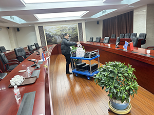 接甲方領導通知,北京特檢院院長一行和江蘇特檢院長交流會將在低溫中心召開。本著給領導留下美好印象的目的,物業(yè)根據(jù)參會流程,全體物業(yè)人員各司其職、各盡職責,齊行動。院區(qū)地面及接待室、會議室阿姨再次精細打掃擦拭,各樓層綠植修剪。保安負責車輛引導停放,車輛停放忙而不亂。根據(jù)參觀路線,阿姨們把各自負責的片區(qū)細節(jié)衛(wèi)生徹底清潔,外圍保潔師傅負責把院區(qū)門牌及小公園設施都全部擦拭一遍,B、C兩個車間的地面,墻壁,玻璃以及門框也徹底大掃除。同時,會務也按照參會人員名單準備席卡、話筒、臺板、筆、毛巾和各種會議所需物品,都秉著所有的物品在同一直線上的標準依次擺好。工作部署有條不紊全部到位,院領導對我們的工作甚是滿意。