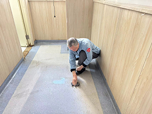 在病區(qū)PVC地面深度清潔工作中,我們始終以"安全與細(xì)致"為作業(yè)準(zhǔn)則。主管全程駐場統(tǒng)籌,提前與護(hù)士長確認(rèn)設(shè)備進(jìn)場時(shí)間,協(xié)調(diào)護(hù)工和保潔轉(zhuǎn)移床頭柜、輸液架等物品,同時(shí)全程關(guān)注員工用水用電及來往行人的安全。清洗時(shí)采取"主次分區(qū)"策略:主通道由專項(xiàng)師傅把控單擦機(jī)行進(jìn)擦拭,確保清潔劑充分作用;墻邊機(jī)器無法清理的地方由樓層保潔使用百潔布手工刷洗,徹底清除踢腳線積垢。