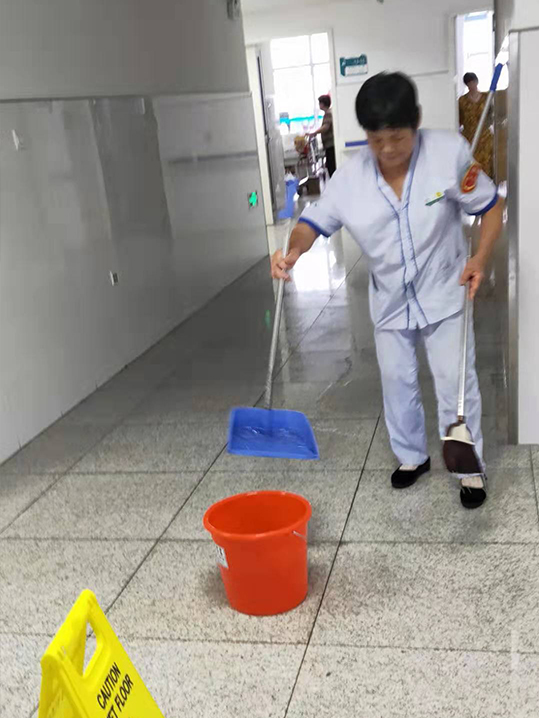 “好醫(yī)管”啟東市人民醫(yī)院項(xiàng)目部,在巡查病房的時(shí)候,內(nèi)科11層的護(hù)士長(zhǎng)打來(lái)電話說(shuō)她們樓層上的開(kāi)水機(jī)進(jìn)水管子突然爆裂,水淌得到處都是,于是我馬上打電話給洗地的師傅,讓他停下手中的活去康復(fù)科處理積水,同時(shí)又派其他的工友去支援。當(dāng)我趕到現(xiàn)場(chǎng)的時(shí)候,阿姨已經(jīng)開(kāi)始在處理積水了,只見(jiàn)一個(gè)阿姨先把防滑標(biāo)志放好,然后用掃帚把積水掃進(jìn)簸箕里,再倒入桶里,等到大半桶的時(shí)候就拎走倒掉,還有一個(gè)阿姨用刮刀把遠(yuǎn)處的積水都趕到一起,然后用吸水機(jī)把積水全部吸干凈。等把走廊里的積水清理得差不多了,師傅又去處理配餐間里的積水,由于配餐間里有硬件設(shè)施,所以角角落落的地方阿姨就只能先用拖把拖,接著再用毛巾擦,終于把所有的積水清理得差不多了,該樓層的保潔阿姨馬上處理了現(xiàn)場(chǎng),看著清清爽爽的走廊,護(hù)士長(zhǎng)對(duì)著工友說(shuō)了句"有你們真好,謝謝你們!"工友說(shuō),那是我們應(yīng)該做的!