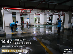 連日來,持續(xù)的高溫天氣席卷全城,室外驕陽似火,熱浪滾滾。雖然小區(qū)地下車庫雖比室外溫度低上一些,能避開毒辣的日頭,可空氣不算流通,空間還是比較悶的,物業(yè)保潔團隊就在這樣的環(huán)境里,全力開展地面清洗工作,用汗水為業(yè)主們營造潔凈舒適的停車環(huán)境。 地下車庫的地面為水泥材質(zhì),本就容易起砂起灰,加之空氣不流通,大量的干灰塵在這樣的空間里積聚。車輛駛過帶起的氣流會讓灰塵四處彌漫,使得整個車庫始終籠罩在一層灰蒙蒙的霧氣里。上午 9 點,當許多人還在空調(diào)房內(nèi)避暑時,保潔員們已穿戴好雨衣、雨鞋,扛著水管、拎著拖把開始了一天的工作。水管打開的瞬間,水流奔涌而出,沖刷著地面的污漬,水花濺在他們的褲腿上,很快便被體溫烘干,留下一圈圈白色的鹽漬 —— 那是汗水蒸發(fā)后留下的痕跡。