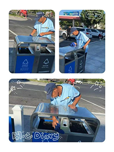 擦完外壁,他蹲下來處理桶底的污漬。這個位置經(jīng)常被垃圾袋蹭到,油漬特別多。最后他換塊干凈的抹布,把整個垃圾桶再擦一遍。擦完的不銹鋼桶亮得能照出人影,連桶蓋上細小的劃痕都看得一清二楚。全部清潔完成后,保潔大叔抹了把汗,看著自己的勞動成果露出滿意的笑容。他總說,垃圾桶干凈了,整個服務區(qū)看著都清爽。