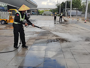 在風(fēng)雨連廊施工圍擋拆除后,廣場(chǎng)上遺留了不少建筑垃圾、灰塵和雜物。面對(duì)這一情況,保安員和保潔員們沒有絲毫懈怠。保潔員們手持掃帚、簸箕等工具,分工明確,對(duì)廣場(chǎng)地面的塵土、碎石等進(jìn)行細(xì)致清掃。他們不放過任何一個(gè)角落,哪怕是藏在縫隙里的微小垃圾,也一一清理出來。同時(shí),部分保安員還使用高壓水槍,對(duì)地面上頑固的污漬進(jìn)行沖洗。經(jīng)過水流的強(qiáng)力沖刷,原本沾滿污漬的地面逐漸恢復(fù)潔凈